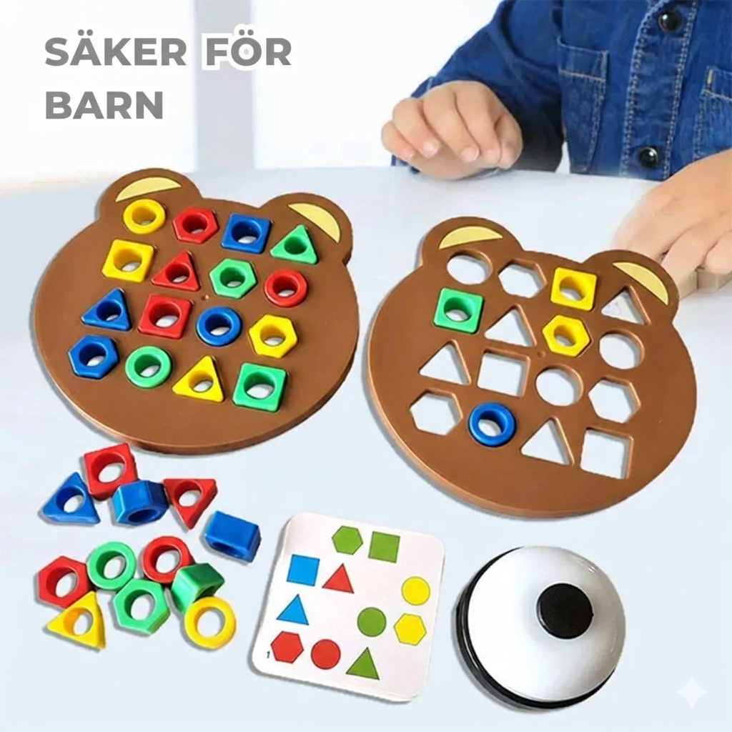 Spelet är enkelt att lära sig men utmanande att bemästra! Två spelare får varsitt spelbräde och olika spelbrickor i unika färger och former. I mitten finns uppdragskortet – den som löser uppgiften först ringer i klockan och vinner!
